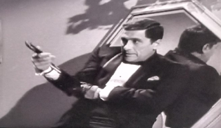 While Honey and Sam slip out... ...Keith ponders a room service delivery. (The significance of which becomes clear only to those who have seen the original version of this episode. The meal was ordered by the thief as a ruse. Nicole never ordered it. Jason Wingreen, as the hotel employee, has no lines in this version of the episode, but he did in the original version; and because he was the one who took this room service order from the thief, he is about to be as chagrined as Lt. Keith is puzzled.)| (L-r, Fred Vincent, Jason Wingreen, and Nancy Kovack) |